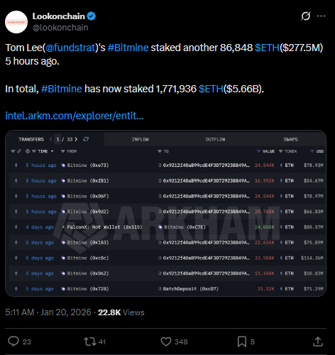 According to recent disclosures, BitMine staked an additional 86,848 ETH, valued at roughly $277.5 million at current prices. This pushes the firm’s total staked Ether holdings to 1.77 million ETH, worth an estimated $5.66 billion.