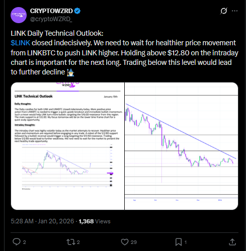 Chainlink began the week hovering near a long-standing support area, with price action reflecting balance rather than momentum. LINK is trading around $12.60, down just over 1% on the day, while daily trading volume has dropped sharply to about $320 million, signaling reduced speculative interest.