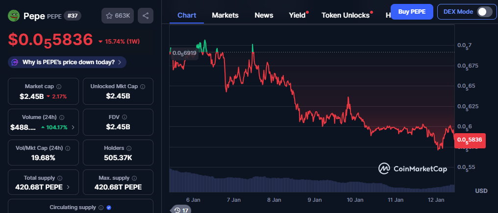 PEPE surged strongly in the first days of January, posting gains of more than 80% before momentum faded. Since then, the token has given back a notable portion of those gains, slipping below a key price area that previously capped rallies in late 2024.